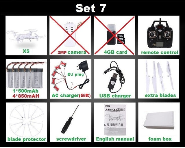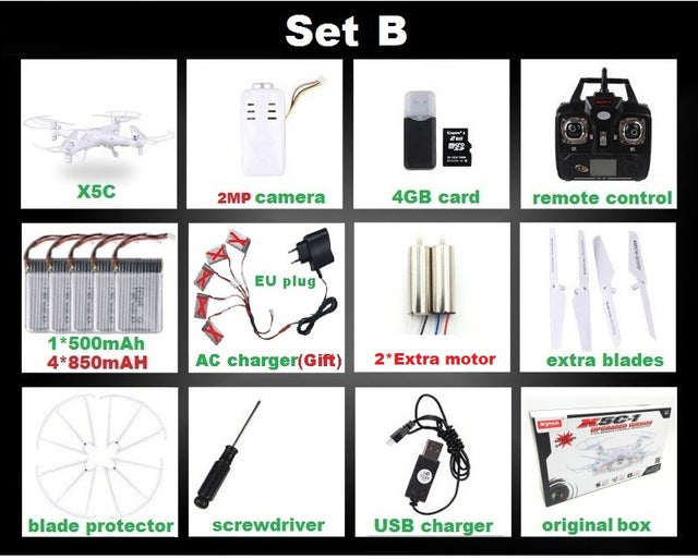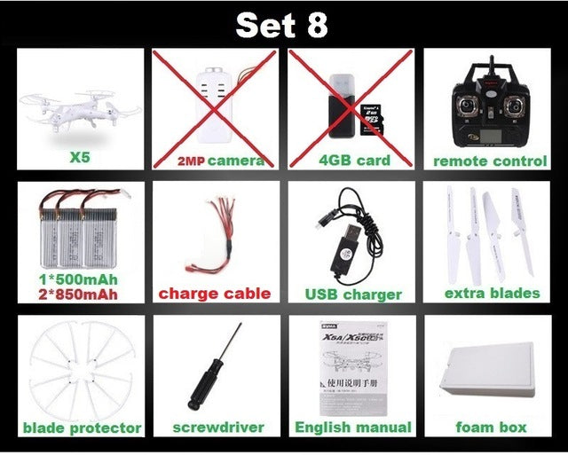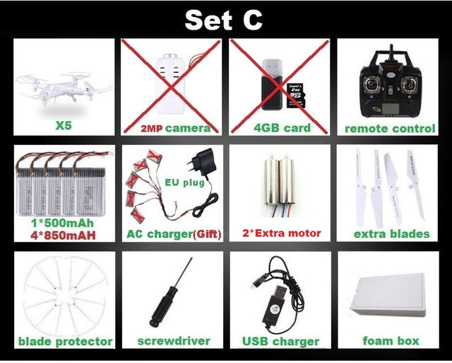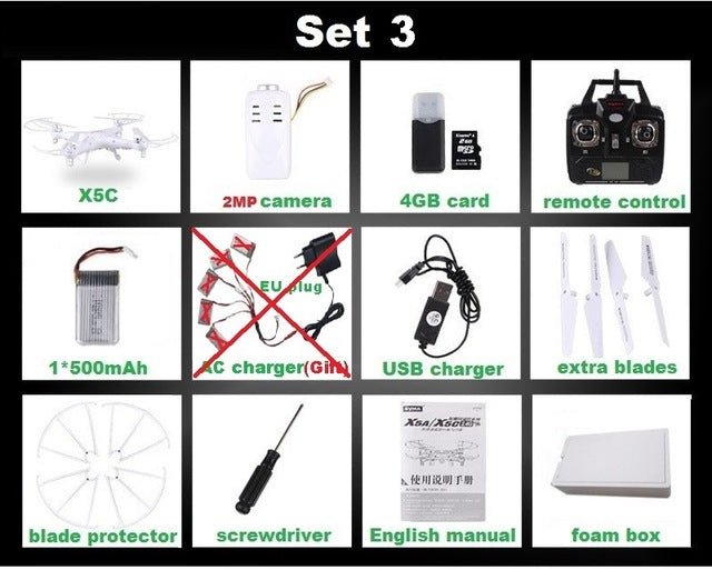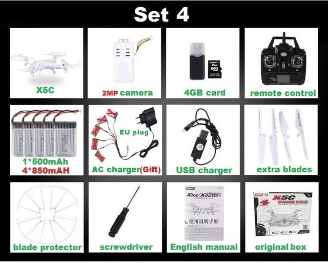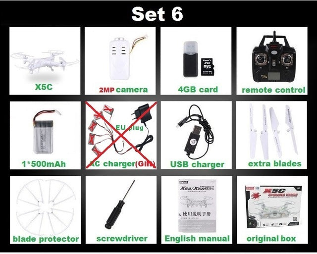 Type: Helicopter Features: Remote Control Aerial Photography: No State of Assembly: Ready-to-Go Remote Distance: 100m Material: Plastic Control Channels: 4 Channels Brand Name: SYMA Certification: CE Model Number: X5 X5C Charging Time: 120 Minutes Package Includes: Operating Instructions,USB Cable,Batteries,Remote Controller,Charger,Camera Power Source: Electric Remote Control: Yes Controller Battery: AA 1.5V * 4 (not included in the package) Motor: Brush Motor Dimensions: 31.5 x 31.5 x 7.5cm Warranty: 1 month Barcode: No Age Range: > 14 years old Charging Voltage: 3.7v Action Time: 7-10 Minutes CE: Certificate Controller Mode: MODE2 Warning: No fire Plugs Type: USB Features: Flashing